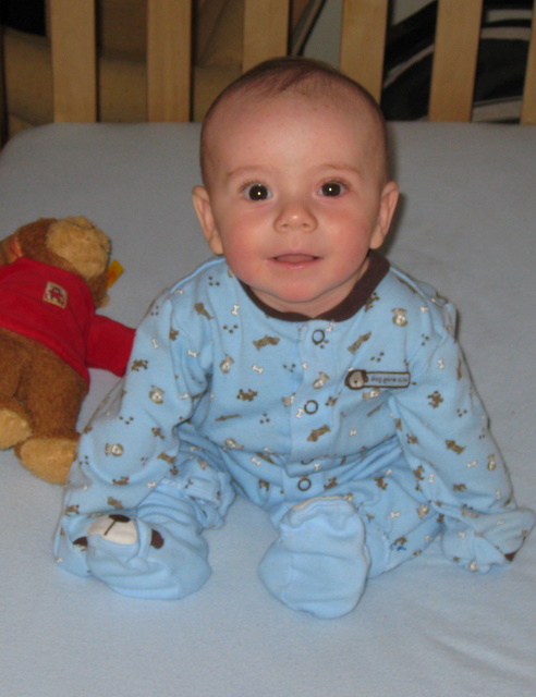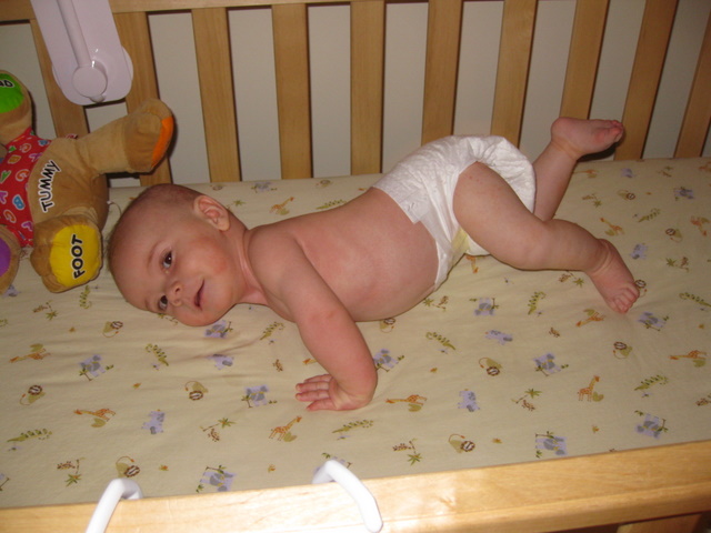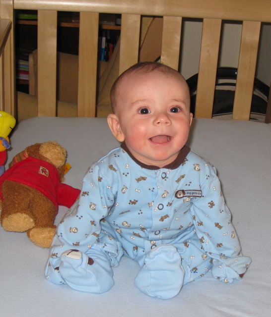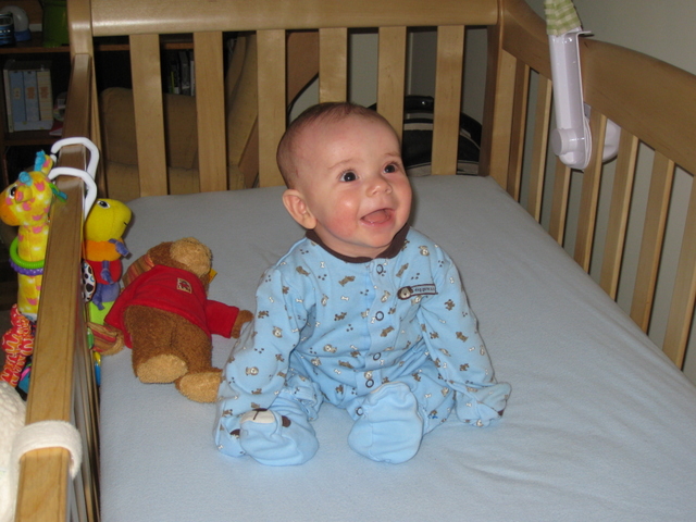 Ben sitting up in his crib.
