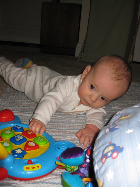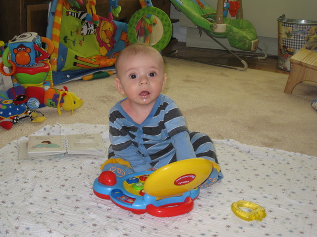 Ben likes to play in his crib.