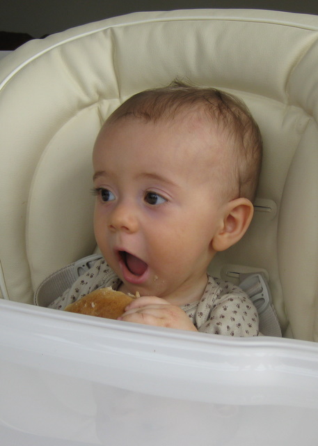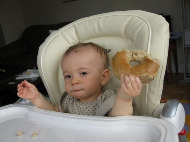 Eating a bagel.