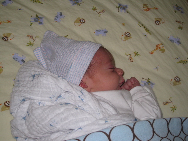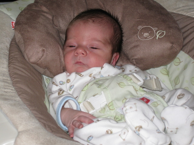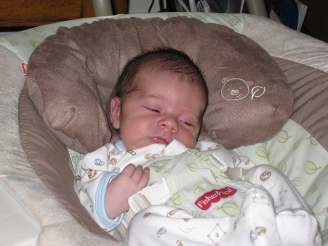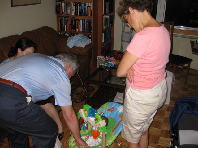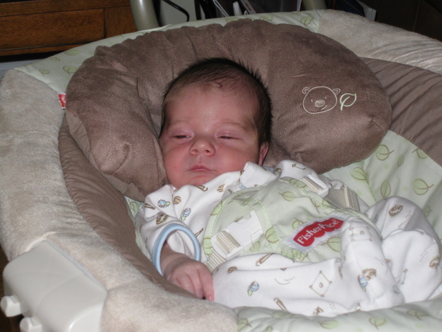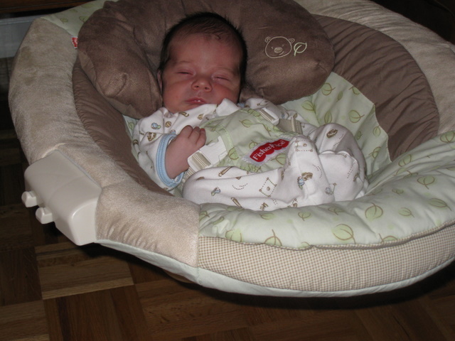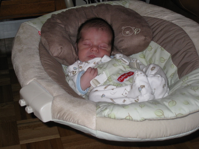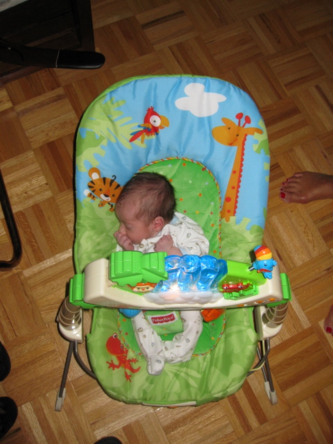 Putting him in the bouncy seat for the first time.